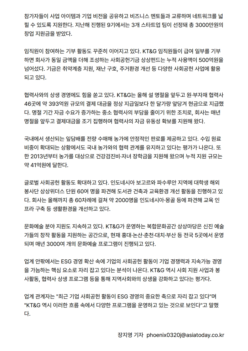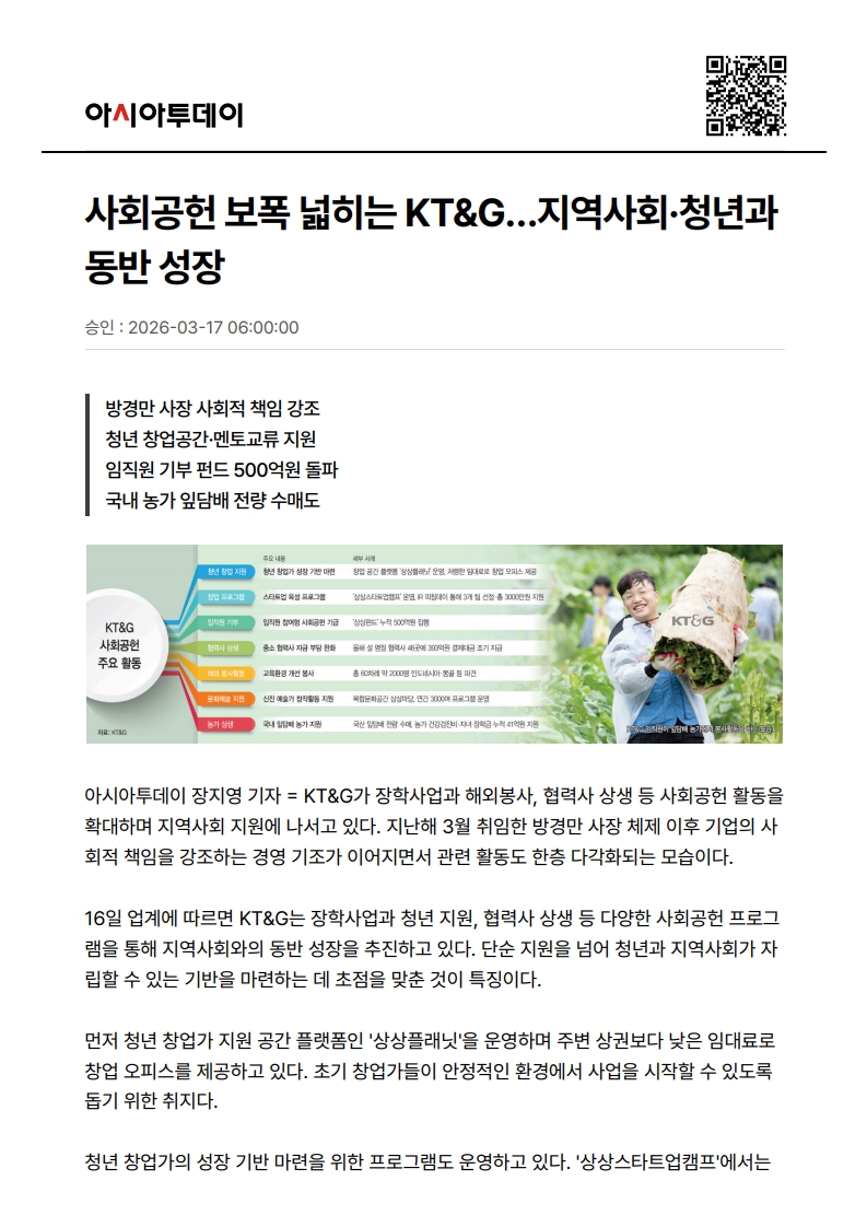 사회공헌기사 사회공헌 보폭 넓히는 KT&G…지역사회·청년과 동반 성장