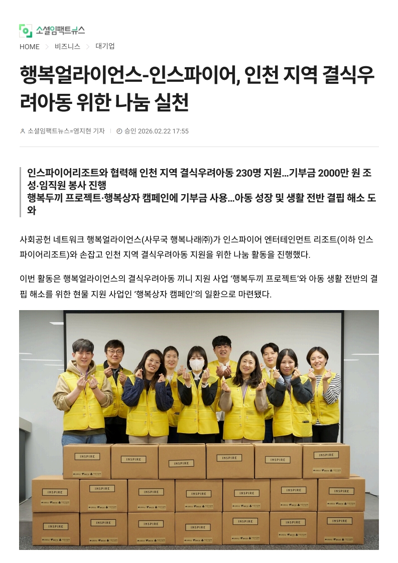 사회공헌기사 행복얼라이언스-인스파이어, 인천 지역 결식우려아동 위한 나눔 실천
