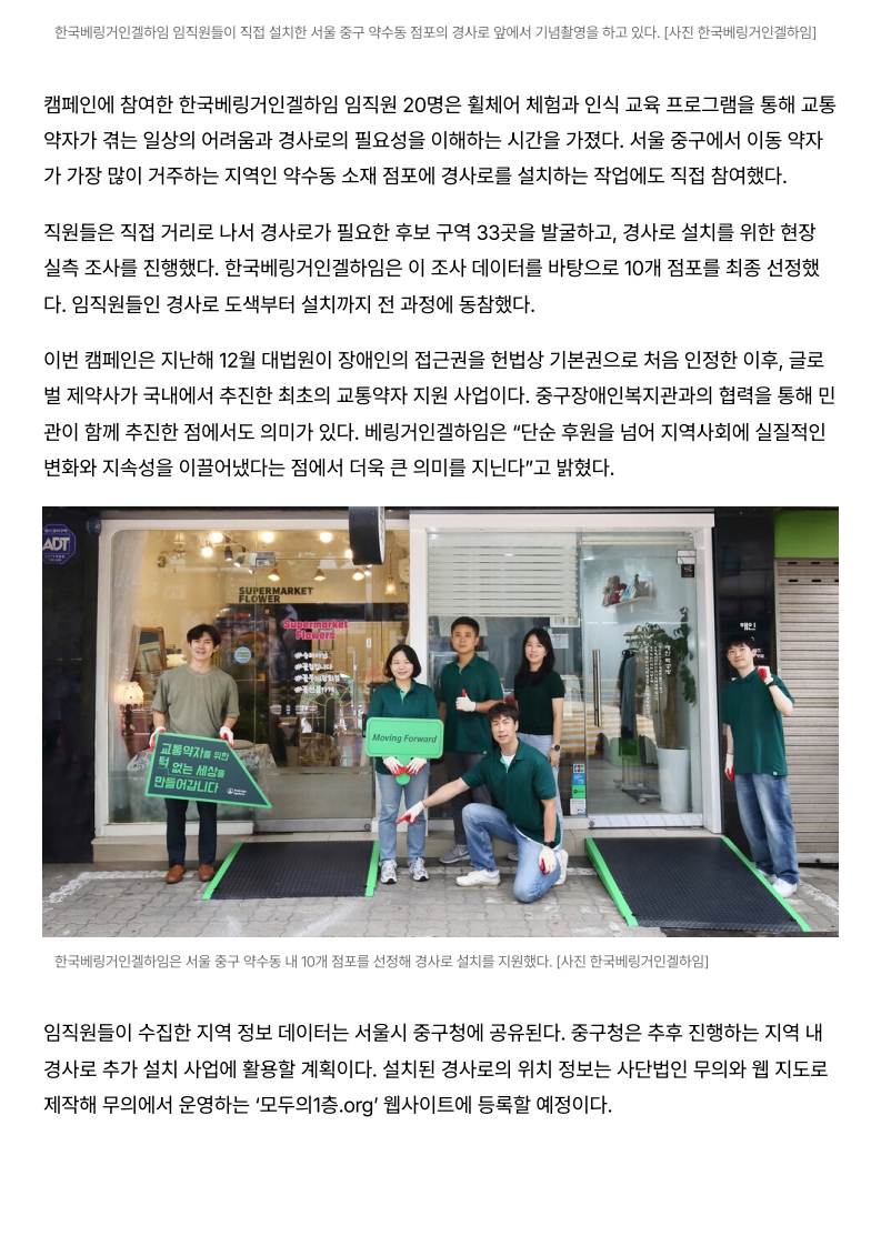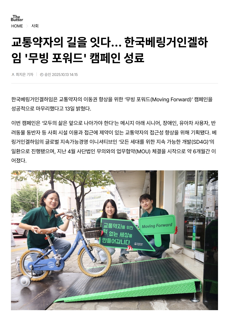 사회공헌기사 교통약자의 길을 잇다... 한국베링거인겔하임 '무빙 포워드' 캠페인 성료
