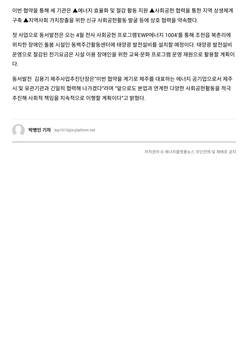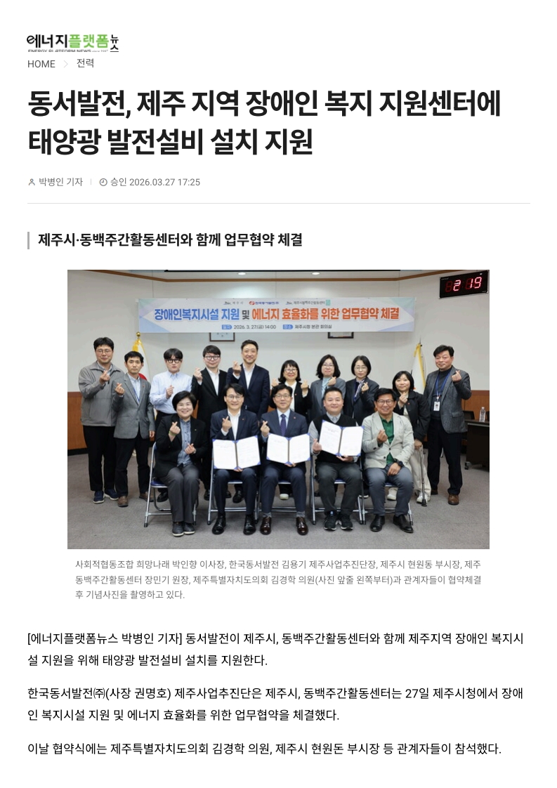 사회공헌기사 동서발전, 제주 지역 장애인 복지 지원센터에 태양광 발전설비 설치 지원
