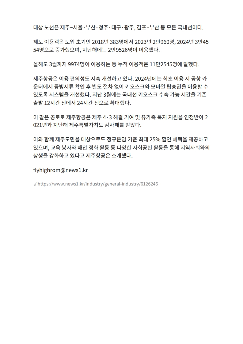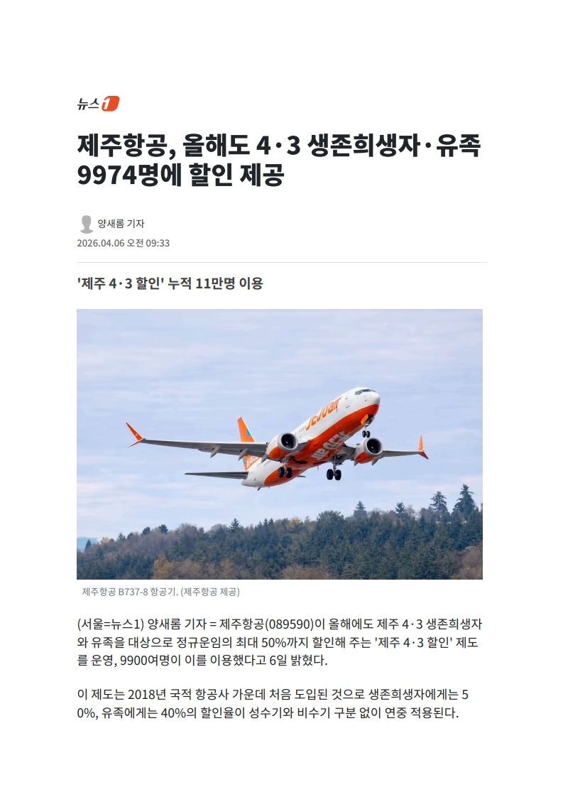 사회공헌기사 제주항공, 올해도 4·3 생존희생자·유족 9974명에 할인 제공